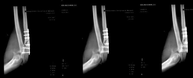 [Ortho] Несросшийся перелом локтевой кости, подвывих предплечья кзади.Перелом венечного отростка. Состояние после резекции головки лучевой. Травма 4 мес. назад.