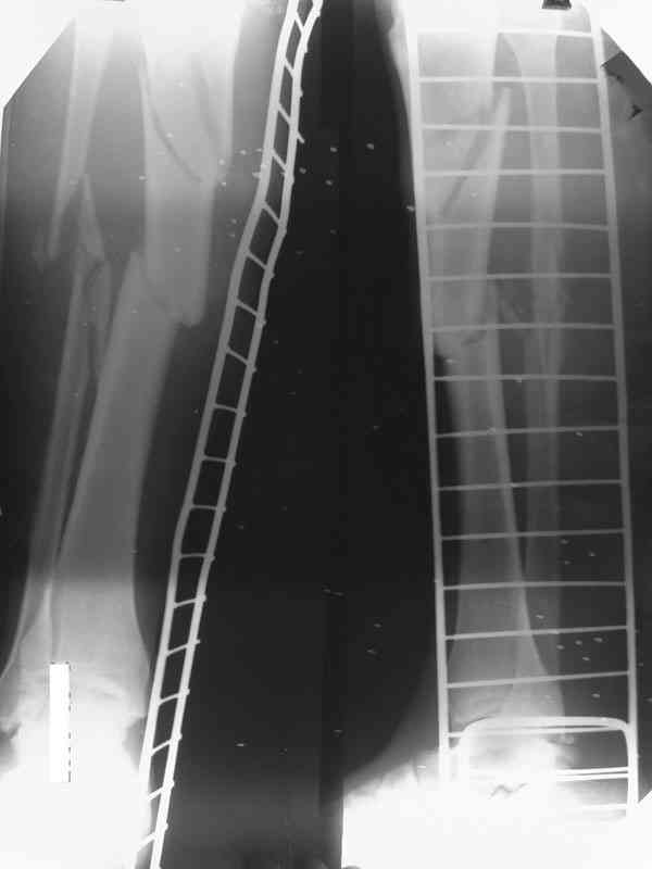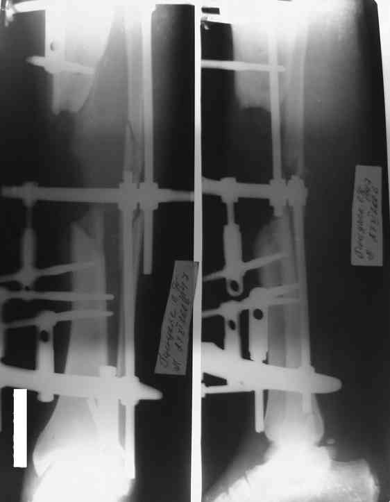 Доводим также к сведенью что дистальный межберцевый синастоз уже состоялся, ложный сустав малоберцевой кости в с/з. Учитывая так же отсутстаие нормального обеспечения больного в послеоперационном периоде мы склоняемся к аппарату внешней фиксации.