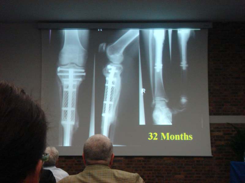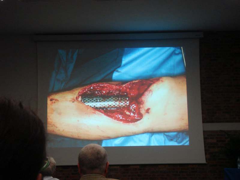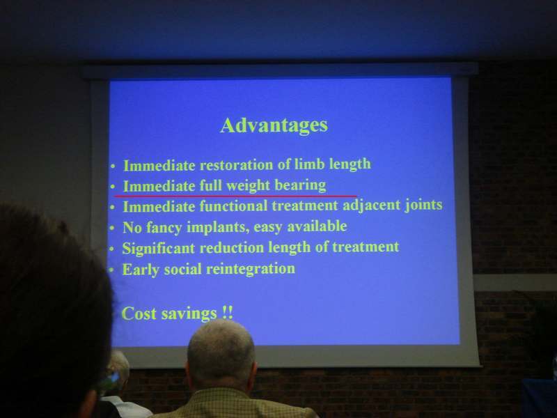 А доклад из Германии, действительно, был интересный. Правда пока у авторов немного наблюдений. И еще прозвучала мысль, этот метод не предназначен для применения при наличии проявлений инфекции. Прилагаю несколько иллюстраций (1 - вид кейджа во время операции перед закрытием лоскутом на свободной ножке, 2 - рентгенограммы через 32 месяца после операции, 3 - слайд, перечисляющий преимущества методики).