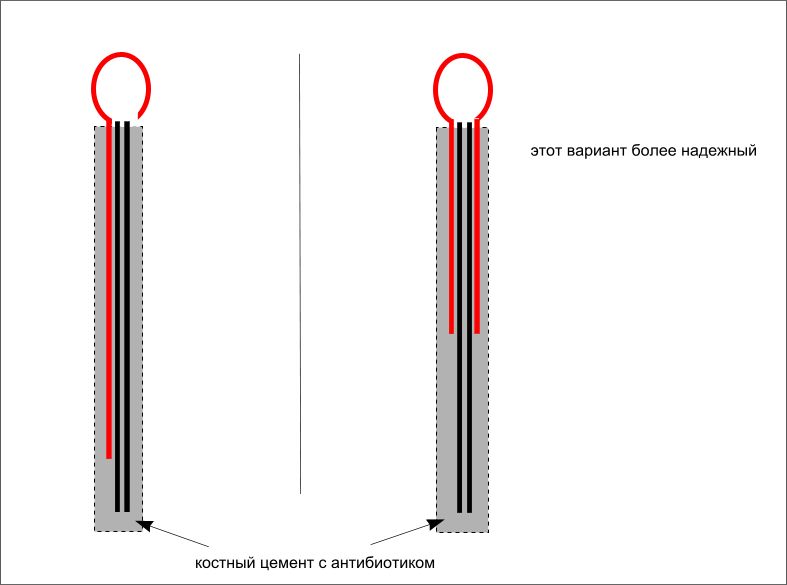 Одно, маленько добавление. У одной пациентки с большим, но еще неокрепшим регенератом большеберцовой кости мы установили подобный спейсер. Она уехала в свой родной город, где врачи демонтировали ей спицстержневой аппарат, фиксировавший сегмент. Но при нагрузке регенерат чуть деформировался. Через 4 месяца уже у нас в институте при удалении спейсера загнутый в виде колечка кончик спицы при тракции разогнулся и мы помучились с удалением, так как зацепиться за спейсер было невозможно. Теперь загибаем спицу несколько иначе (рис. 4).