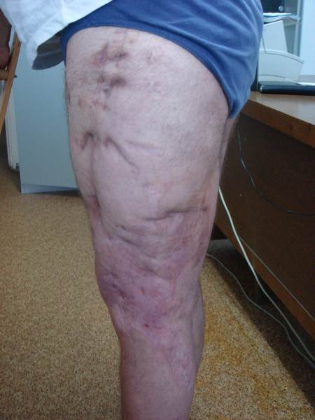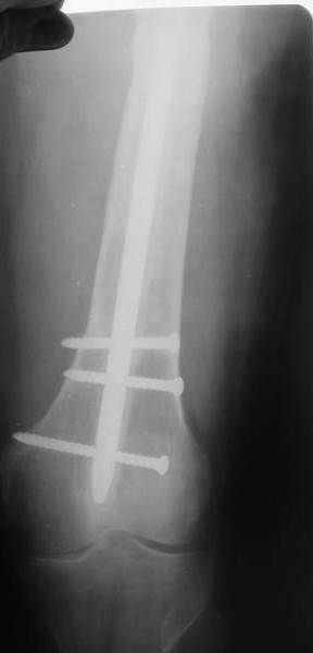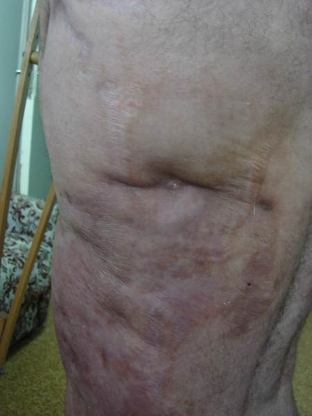 В настоящее время наш пациент ( см. http://weborto.net/forum/1177351385/index_html) ходит с одним костылем. У него периодически открывается свищ на задне-наружной поверхности бедра с умеренным серозно-гнойным отделяемым. Температура тела и анализы нормальные. На рентгенограммах имеются признаки консолидации ложного сустава.