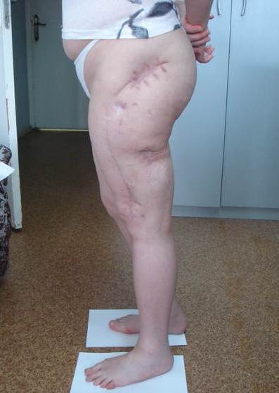 1, 2 - вид бедра на операции (имеется гнойное отделяемое из свища в верхней трети бедра);