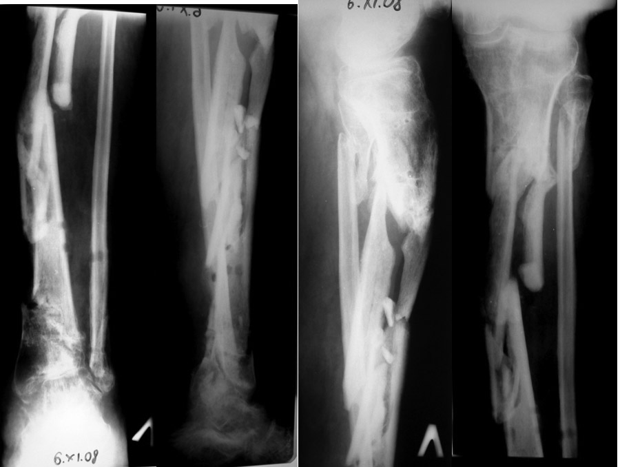 Обдумываем варианты лечения: Аппарат Илизарова: два кольца на проксимальный отдел голени, два кольца на промежуточный фрагмент, два кольца на дистальный, остеотомия малоберцовой кости. 1.Закрыто сделать дистракцию-компрессию между отломками проксимального и дистального фрагментов 2. Или открыто резекция концов фрагментов с укорочением. 3 Удалить целиком средний фрагмент и <зарастить> регенератом.