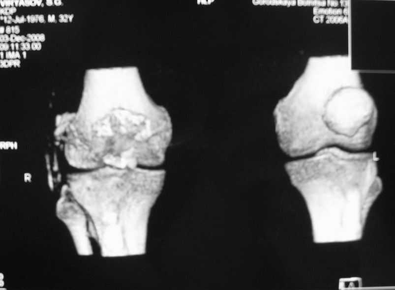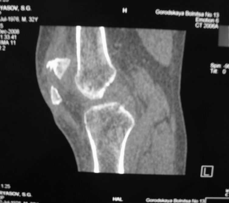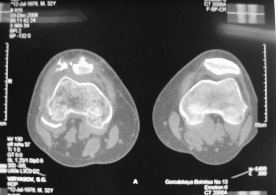 Уважаемые коллеги! Обратился пациент 32 лет с травмой коленного сустава от июля 2008 года - падение с мотоцикла, прямой удар передней поверхностью коленного сустава. Диагноз - открытый оскольчатый перелом надколенника. В одной из больниц города выполнили ПХО, шов надколенника лавсаном. Заживление раны с частичным нагноением(разведена на участке 3 см).