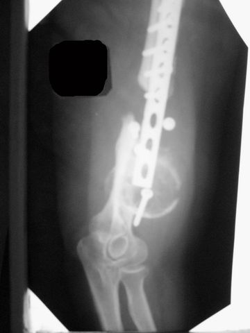 Уважаемые коллеги! Обратилась женщина 38 лет, соматически здорова, ORIF наружным доступом в 2005 году (к сожалению снимки пока не нашли), перелом типа В1. После остеосинтеза никуда не обращалась. Летом прошлого года (через 2 года после операции) во время перетаскивания стиральной машины появились боли в оперированном плече, но пришла лишь сейчас. Клинически: варусная деформация, патологическая подвижность, объем движений в локтевом суставе почти полный, неврологических расстройств нет, признаков инфекции нет. Коллеги, как вы думаете, возможно ли срастить данный неоартроз? Микрохирургия недоступна. Честно говоря, не встречаясь с такими последствиями никогда ранее, надеюсь на помощь "коллективного разума".