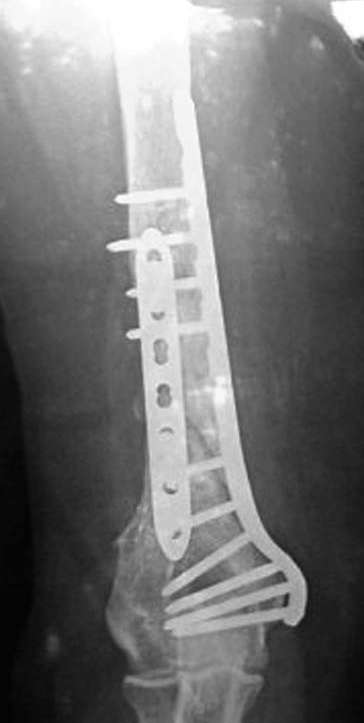 Ложный сустав фиксирован двумя локинг плейт с аутокостной пластикой,