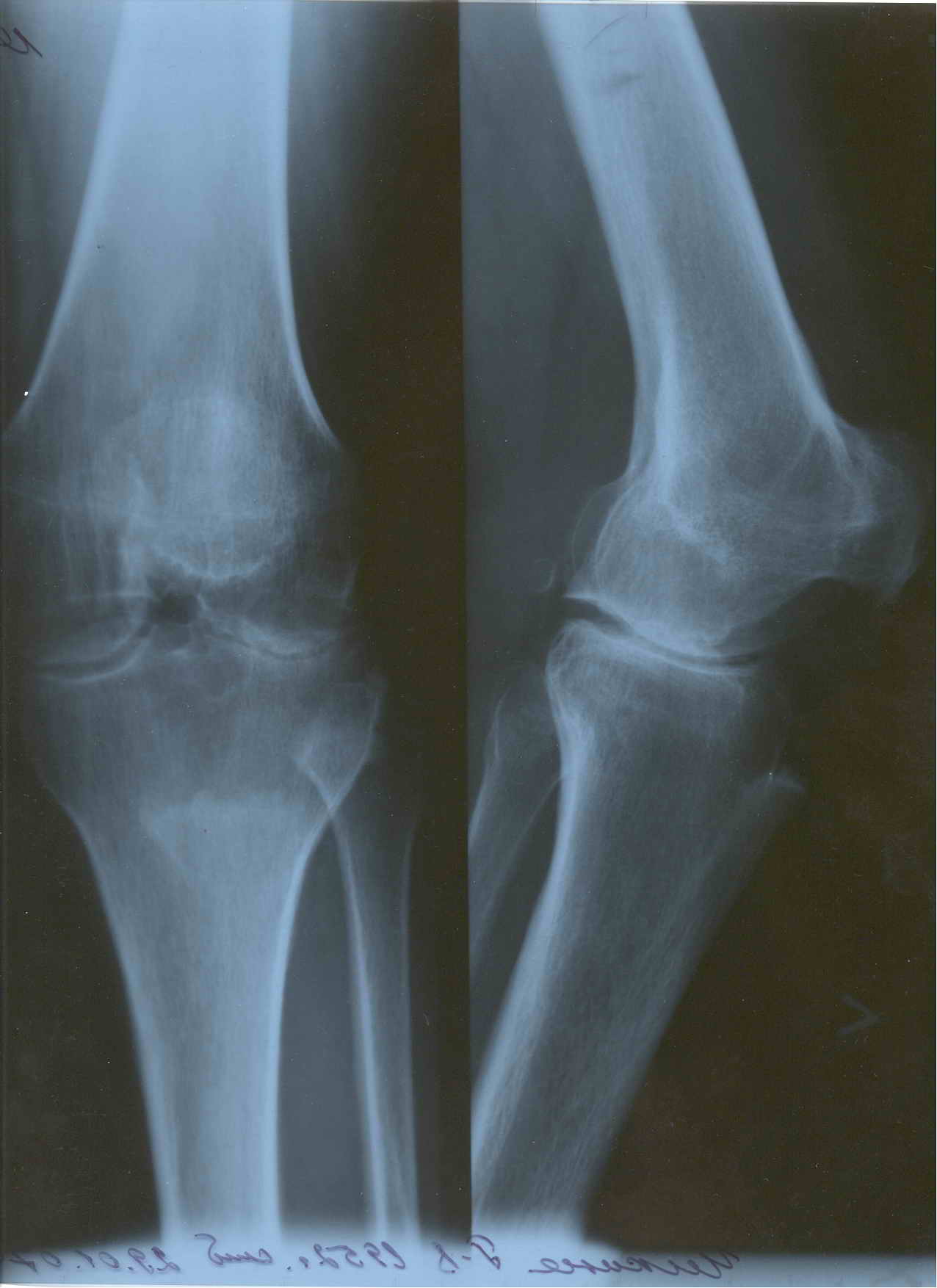 Коллеги занимающиеся TKR прошу совет. Обратилась пациентка 55 лет без сопутствующих проблем со здоровьем для установки коленного сустава по линии ФСС (показания установлены комиссией год назад). В программе эндопротез Зиммер LPS Legacy. После осмотра пациентки возникли сомнения в целесообразности артропластики. История: в 1998 году после серии кеналогов перенесла септический гнойный гонит с исходом в фиброзный анкилоз коленного сустава в позиции сгибания 40 град и костный анкилоз надколенниково бедренного сустава. В 1999 году в ЦИТО рекомендовано эндопротезирование (в тот период еще были движения). С 2000 года подвижности нет. Соответствующая гипотрофия 4-гл. мышцы бедра, относительное укорочение и т.д. Вопросы? 1. Целесообразно ли эндопротезирование вообще? 2. Реально ли использование вышеуказанной модели эндопротеза в данной ситуации или следует установить "Хинч"? 3. Чем бы Вы помогли пациентке, если не надо протезировать ( коррегирующий артродез приходит на ум)? Социально - инвалид 3 группы, пенсионер по возрасту, не очень богата. Спасибо заранее. Доктор А Рыков. Хабаровск. Снимки в прищепке.