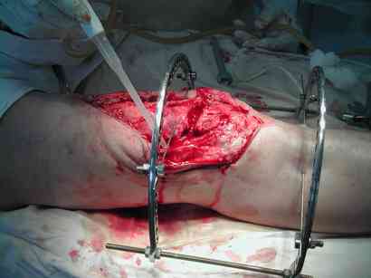этим наложили модуль из аппарата Илизарова - 2 опоры и 2 спицы (в