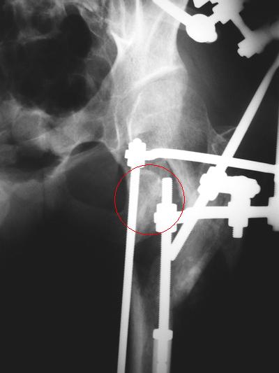 Девушка 21 года 02.10.07 г. пострадала в результате падения с высоты 4-го этажа при пожаре в одном из студенческих общежитий г. Москвы. Получила тяжелую сочетанную травму, в том числе закрытый оскольчатый чрез- и подвертельный перелом левой бедренной кости. Лечилась в одной из больниц столицы. Бедро было фиксировано при помощи скелетного вытяжения. Через полтора месяца после травмы переведена в институт им. Склифосовского. У больной имелись: поддиафрагмальный абсцесс, трахеопищеводный свищ, трахеостома, гастростома, несостоятельность швов раны передней брюшной стенки, укорочение левого бедра на 10 см (рентгенограммы при поступлении - рис 1.).