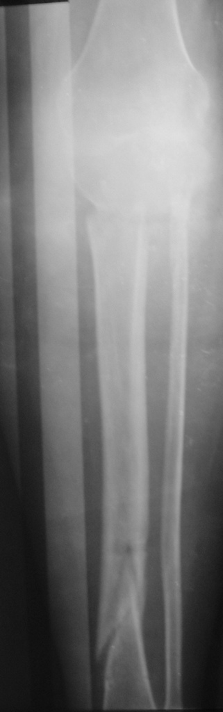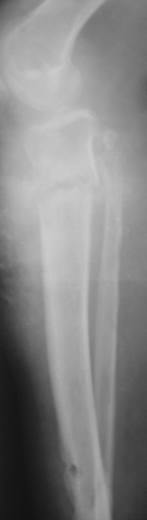 Женщина 30 лет,инвалид 1-й группы по рассеяному энцефаломиелиту (клинически нижний парапарез). В январе 2008 года получила закрытый винтообразный перелом большеберцовой кости в н/з и шейки малоберцовой кости со смещением отломков. После травмы развились обширные эпидермальные пузыри голени и голеностопного сустава. После заживления ран произведено наложение аппарата Илизарова.П/о период без особенностей, больная поставлена на ноги (с ходьбой, естественно, проблемы). Наблюдалась на дому. Спустя месяц после операции отмечалось воспаление м/тканей области спиц проксимального базового кольца аппарата, отек в/з голени (больная передвигалась по дому на четвереньках!).Пришлось поменять кольцо на больший диаметр.Воспаление купировали. К концу второго месяца фиксации воспаление в области верхних спиц опять возникло, отделяемое сукровично-гнойное, незначительное.Проводилось местное лечение, отмечался умеренный отек голени в в/з, болезненность, гиперемии не было. Через три месяца после операции - клиническая проба, перелом сросся. Аппарат демонтирован. Спустя 4-5 дней после демонтажа отмечалась гипертермия до 39 в вечернее время. Раны кроме верхних зажили без проблем, верхние - в прежнем состоянии (незначительное серозное отделяемое).Проводилась АБТ, туалет ран, дренирование. Спустя 2 недели после снятия аппарата мать больной отметила появление подвижности в области коленного сустава. При осмотре - деформация голени в в/з (на уровне верхних спиц), подвижность на протяжении в/з, болезненность. Отек умеренный в в/з, гиперемии нет, гипертермия локальная умеренная.Коленный сустав отечен, жидкости нет. Сделали снимки (в приложении) - вот какая картина Больную госпитализировали - гипсовая лонгета, противовоспалительная терапия, взяли посев из ран. В анализах -лейкоциты до 8 тыс, сдвига формулы нет, СОЭ 42, но больная проходит курсы лечения бетафероном по РЭМ.