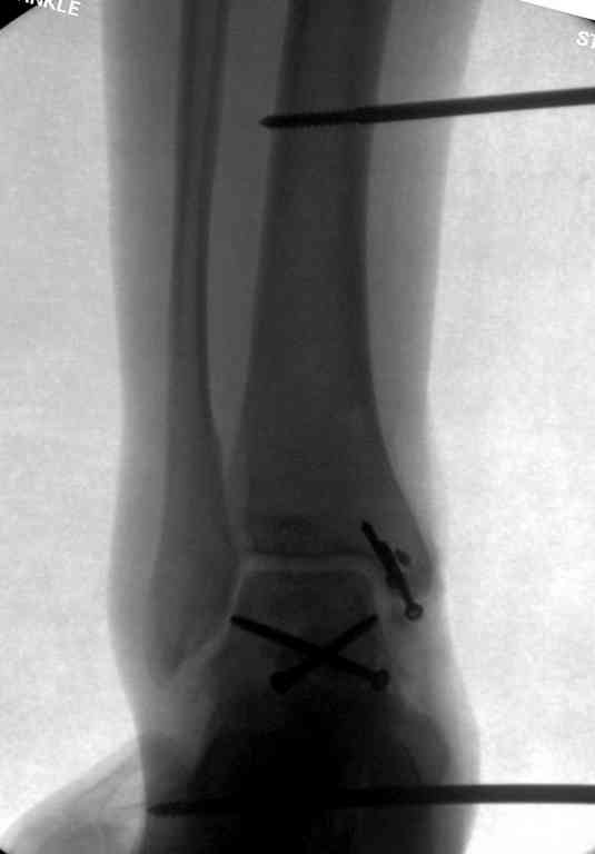 При случаях, когда невозможно проведение первичной фиксации, временный наружный фиксатор является облегчающим инструментом, потому что создается разгрузка сустава в таранно-большеберцовом сочленении и создаются наилучшие условия для заживления ран.