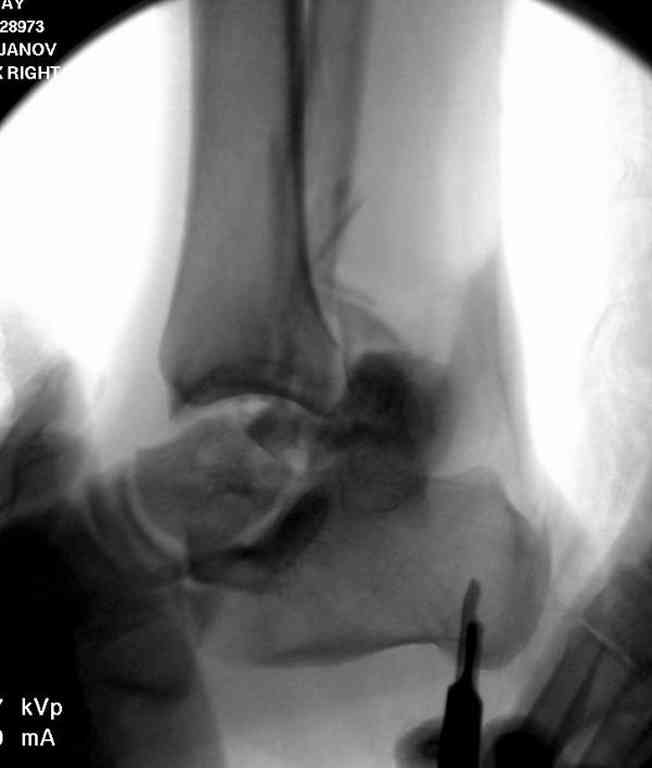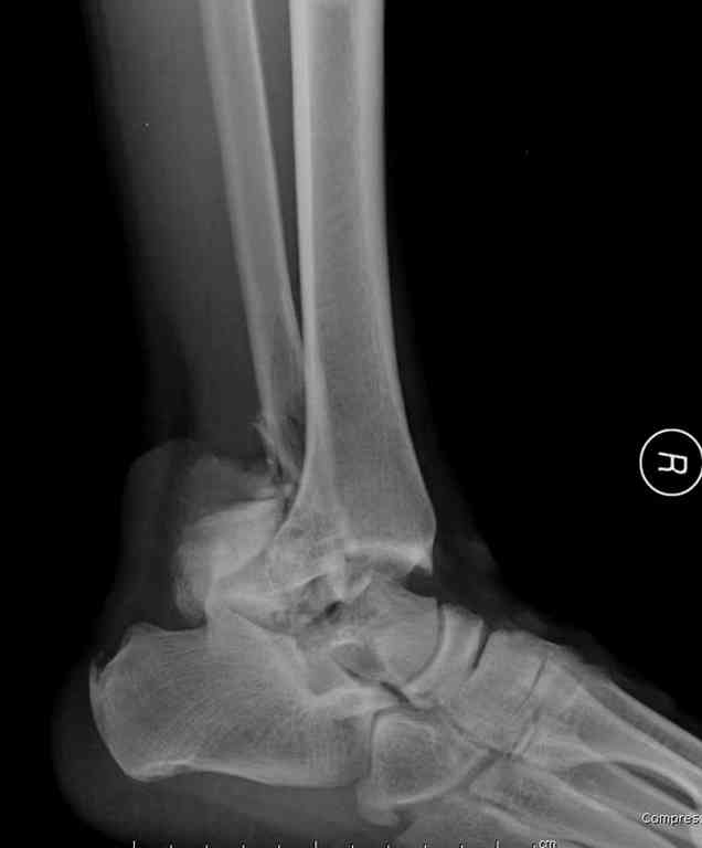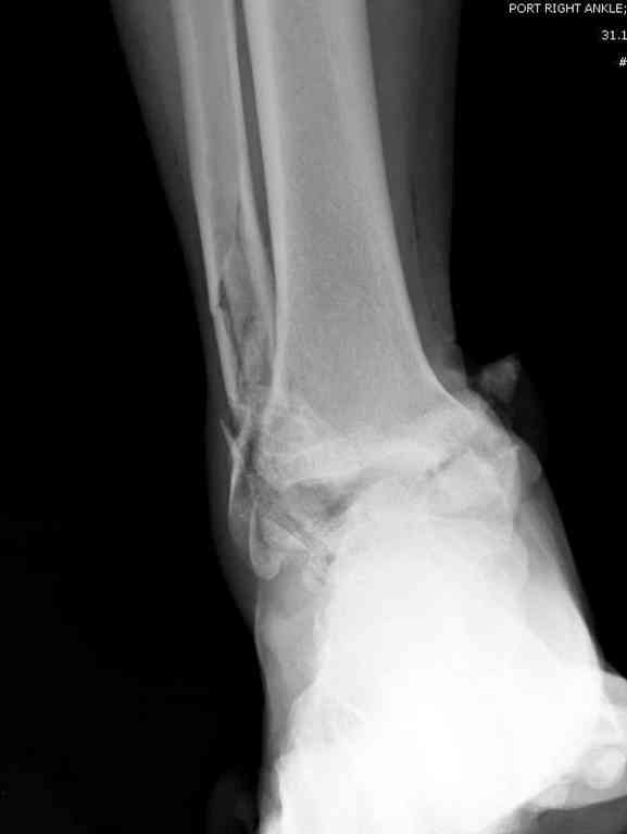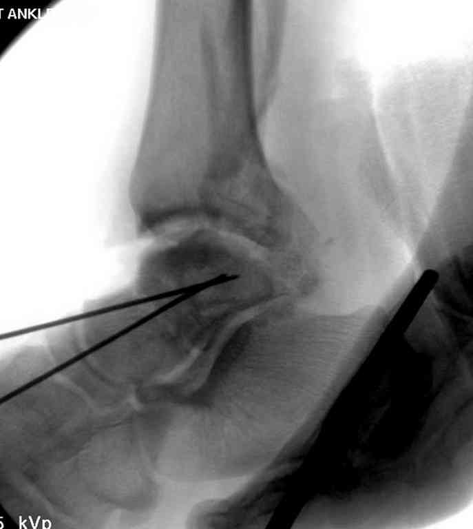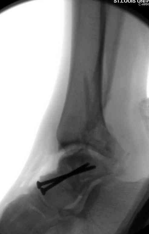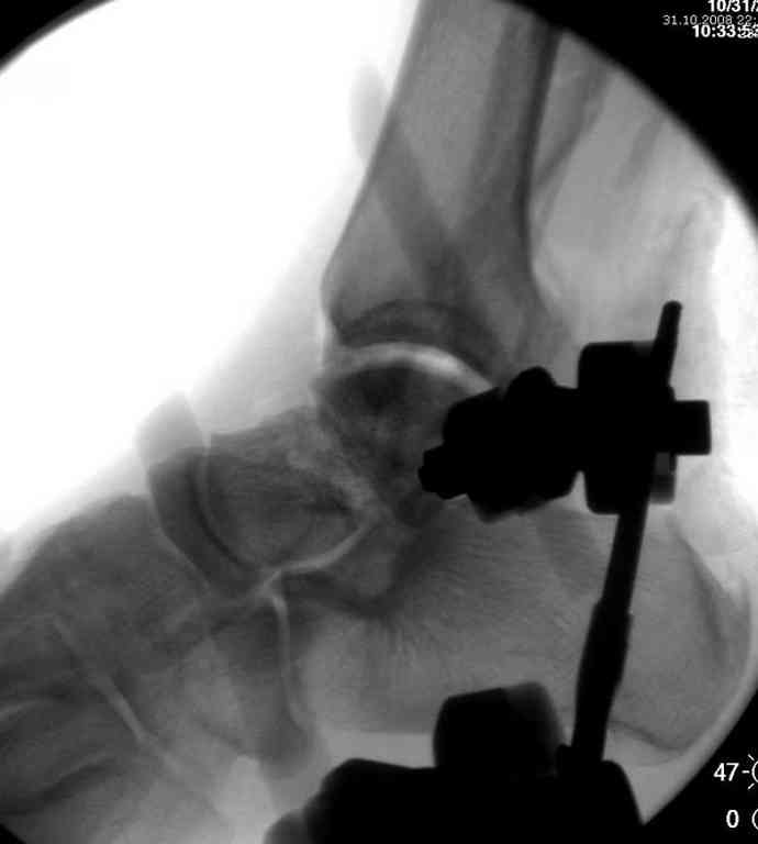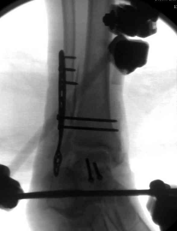 Из-за многооскольчатости дистальной части малоберцовой, где невозможно было провести фиксацию шурупами, перелом зафиксирован подпирающей пластиной, которая должна служить дополнением отсутствующей дистальной части малоберцовой (lateral cortex substitute).