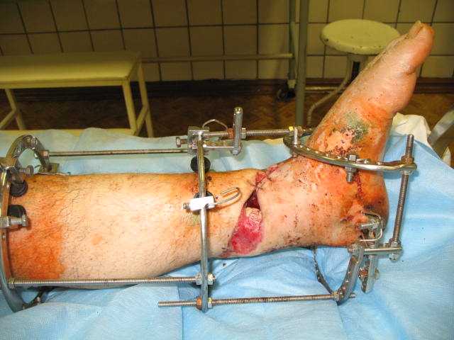 Через 4 часа после поступления оперирован: после неоднократного промывания раны тёплой проточной водой с мылом, антисептиками, при ревизии определяется земля в канале проксимального отломка на глубину 3 см..., отсутствие надкостницы на концах дистального и проксимального отломков на 3 см. Удалено значительное количество мелких костных фрагментов, перемешанных с землёй, выполнена ПХО раны, резекция проксимального конца большеберцовой кости на 3,5 см, ЧКДО аппаратом Илизарова. Рана не ушивалась.