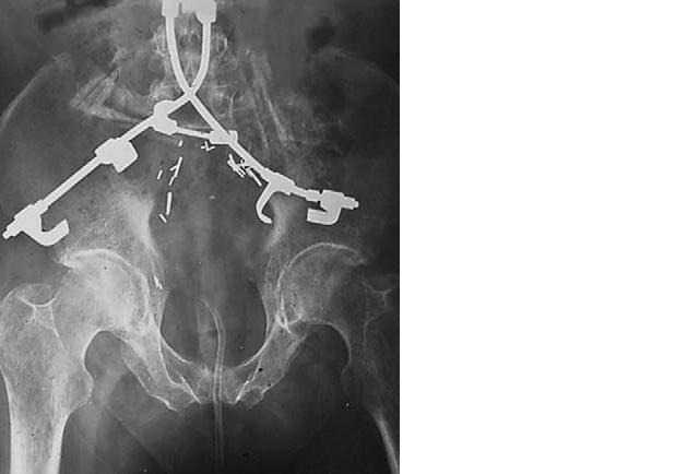 Для бедной российской действительности альтернативу можно смастерить из 2 стержней один конец которых изгибается S-образно, затачивается и вбивается прямо в подвздошные кости (методика Гальвстона). Прксмимальную фиксацию стержней можно выполнить по Люке (совсем для бедных) или к ТП винтам. Третий вариант с крючковой конструкцией (рентгенограмма отдельной вкладкой). Лучше зафиксировать 3 поясничных позвонка.