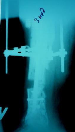 2) После репозиции более очевидна стала проблема дефекта кости в верхней трети голени, два фрагмента свободно лежат. Остановились на варианте перехода на интрамедуллярный синтез стержнем с покрытием костный цемент+ванкомимцин и замещении дефекта с помощью транспорта фрагмента (рис 2)