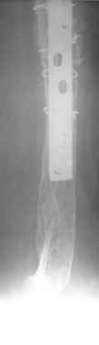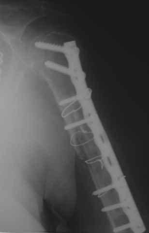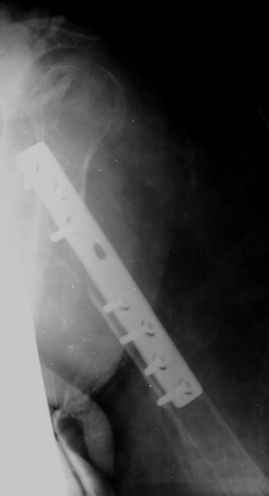 На консультации больная 65 лет. С одной рентгенограммой - рис.1. Анамнез: 30 августа перелом левой плечевой кости, невропатия лучевого нерва - кисть повисла сразу. Лечение по месту жительства - иммобилизация косынкой. 2 октября в одной из больниц города металлоостеосинтез. Все развалилось. 16 октября - повторная операция, через десять дней - картина на рис.1. Далее металлоостеосинтез с костной аутопластикой малоберцовой костью 9 февраля 2009г. Снимки 2-4 выполнены сегодня.