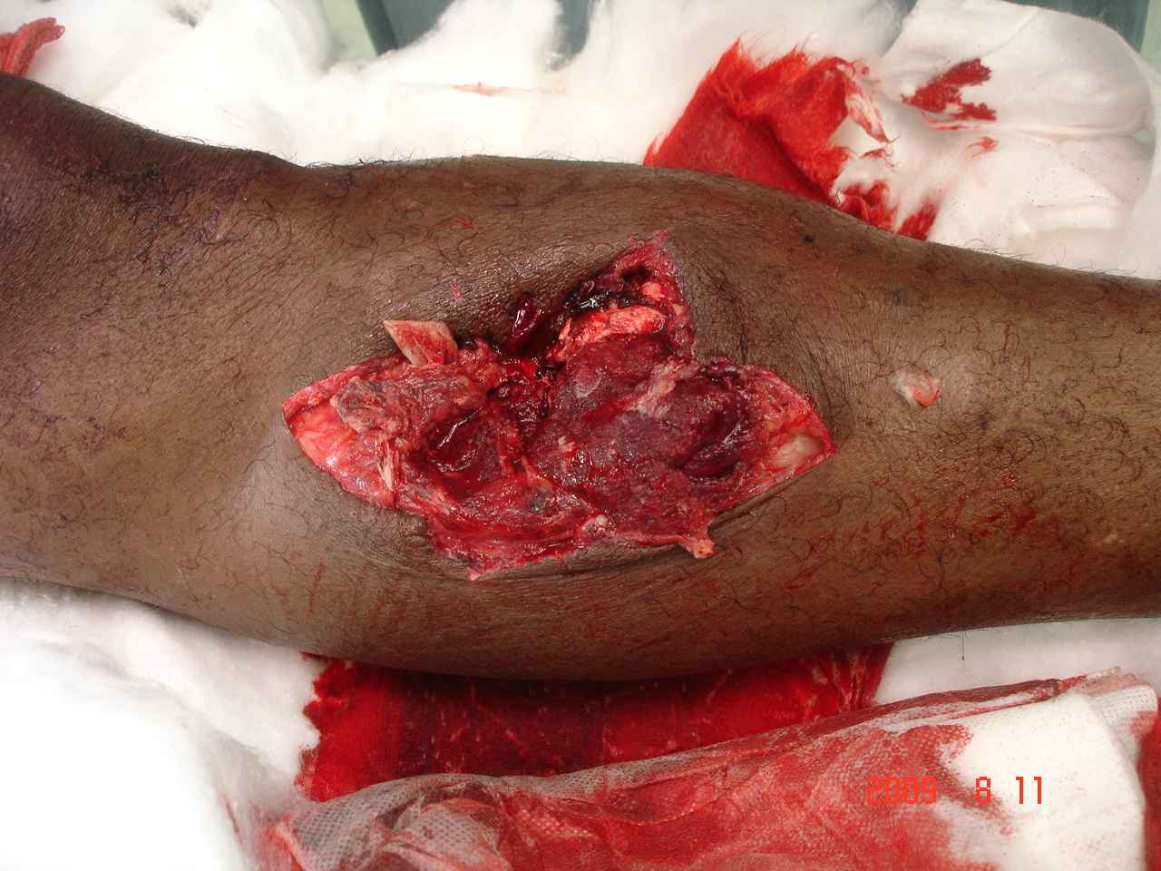 25.08.09 повторная Irrigation&Debridment. Пластик хирург не стал рисковать с Soleus flap из-за отечности, и применен Gastric flap, кожная пластика на медиальную и латеральную рану; аллографт из костных стружек с BMP. Поверхность вакуумирована VAC системой на 4 дня (14-16)