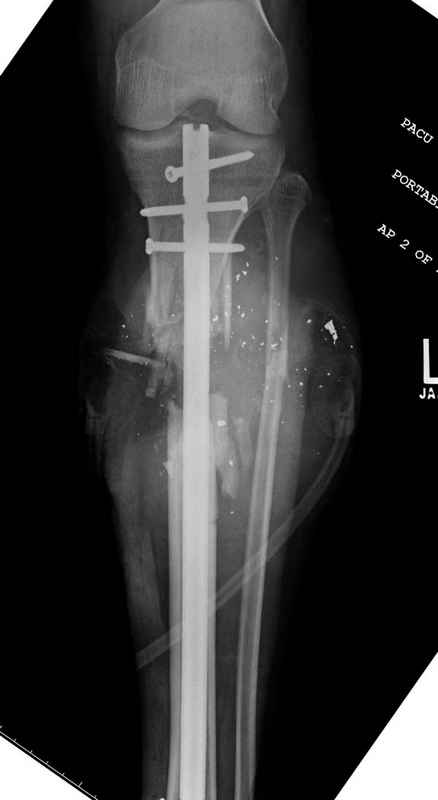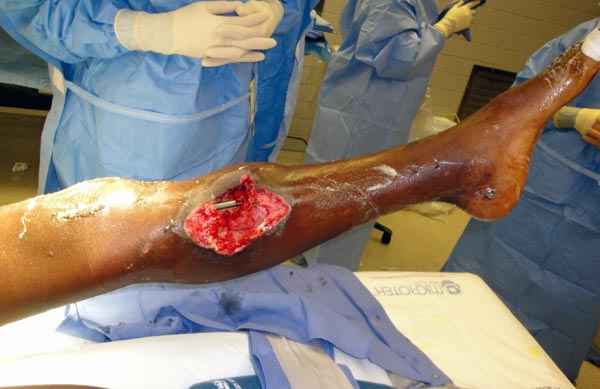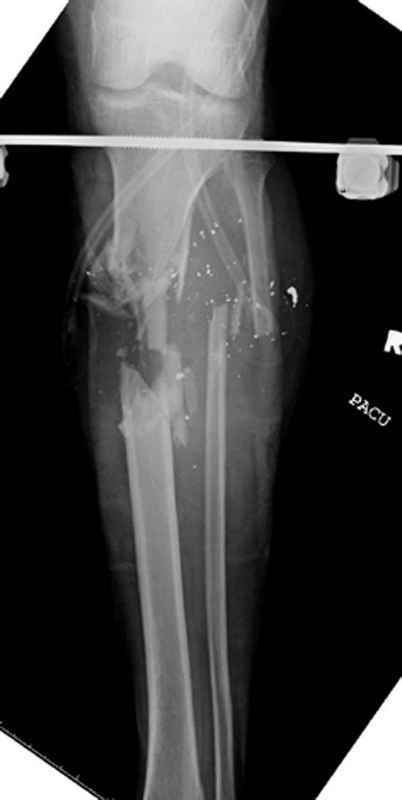 Здесь представлен больной 27 лет с ранениями, включая огнестрельный перелом большеберцовой кости.