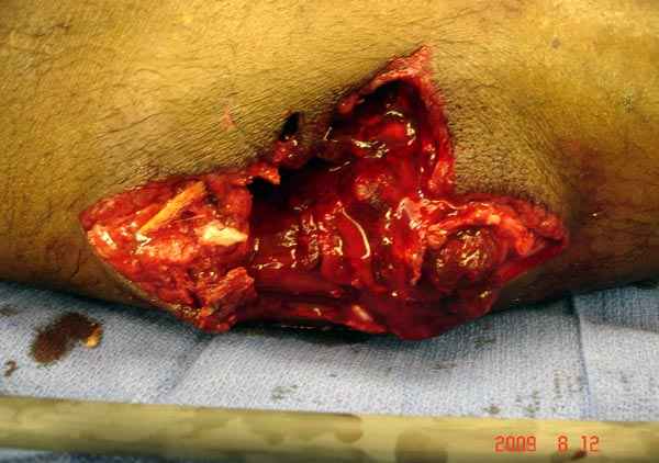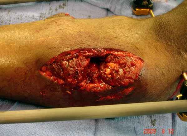 11.08.09 доставлен в операционную, Irrigation&Debridment c фиксацией Наружным Фиксатором и вакуумирование VAC; службой травмы пройзведена ангиография с негативным результатом. (снимки 1-10)