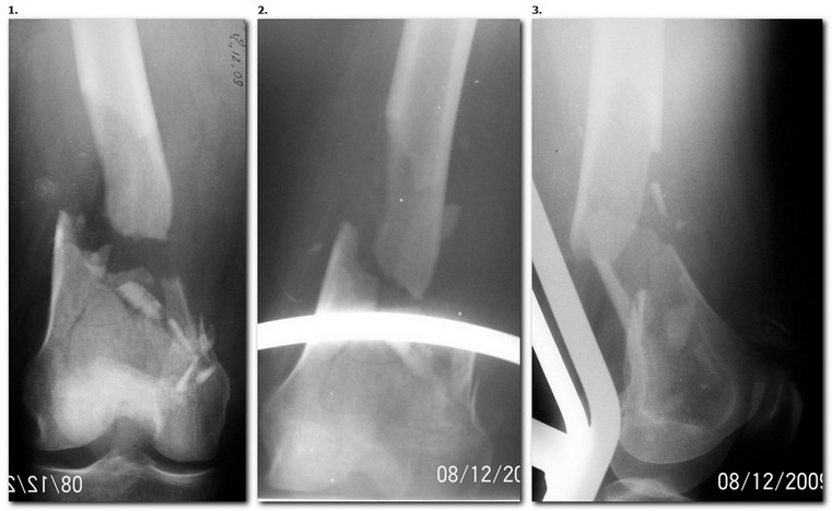 открытый оскольчатый перелом н/3 правой бедренной кости. Создается впечатление о дефиците