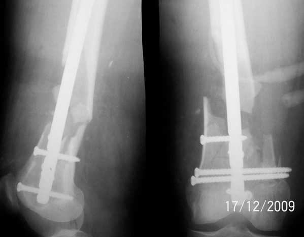 пластика не проводилась. Выбранный штифт по каналу бедренной кости на фоне отсутствия