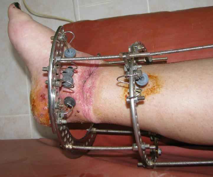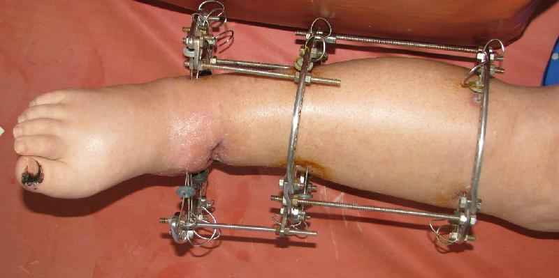 через 3 недели после травмы в ОКБ выполнена артротомия, некрсеквестрэктомия б/берцовой