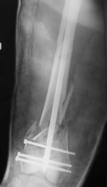 Результат операции блокирующего остеосинтеза многооскольчатого перелома бедра.
