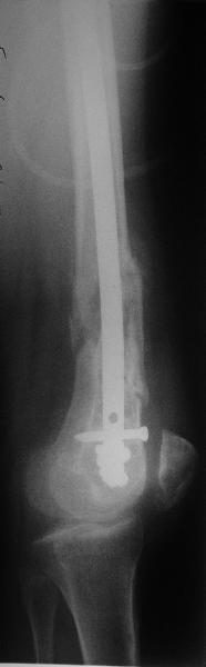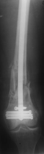 ПВ> Результат операции блокирующего остеосинтеза многооскольчатого перелома бедра.