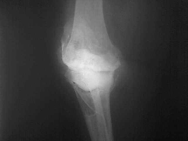 Коллатеральных связок нет. Собственная связка надколенника цела. До удаления протеза -