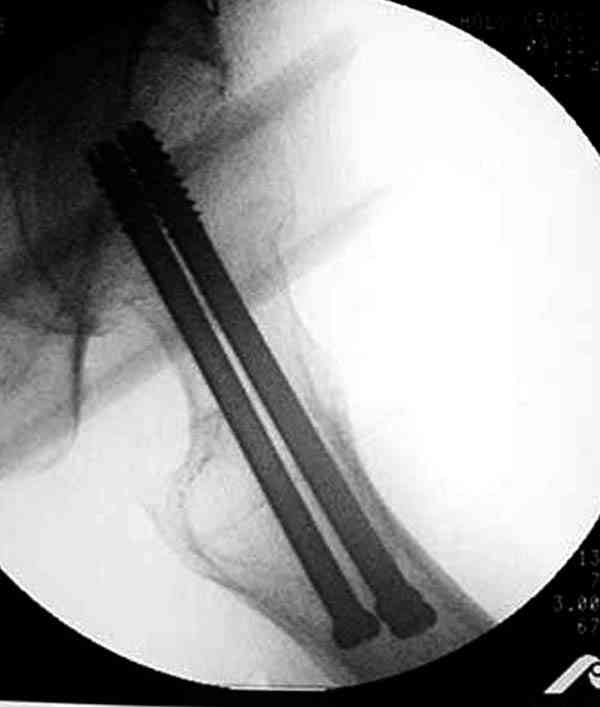 Здесь случай перелома из-за ослабления латерального кортекса через 3 недели после операции на шейке. Шурупы были установлены под большим углом, слабый латеральный кортекс не выдержал нагрузку.