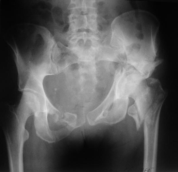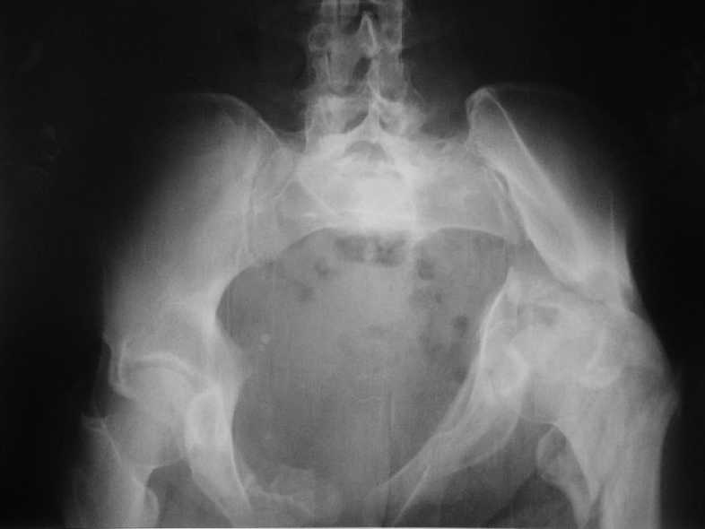 Имеется вертикальное смещение левой половины таза с выраженным отведением крыла (клинически подвижности нет), несросшийся низкий двухколонный перелом левой вертлужной впадины с потерей конгруэнтности, укорочение около5 см, застарелый разрыв лонного сочленения, неправильно сросшиеся переломы обеих ветвей правой лонной кости с укорочением, патологическая подвижность лоно-седалищного фрагмента слева. Правая нижняя конечность неопорна, несмотря на то, что лежа прямую ногу поднимает, ходит на левой ноге (ортопедическая обувь) с костылями, справа тазобедренный ортез. Седалищные нервы работают.Урологи отпустили больную на 6 мес.