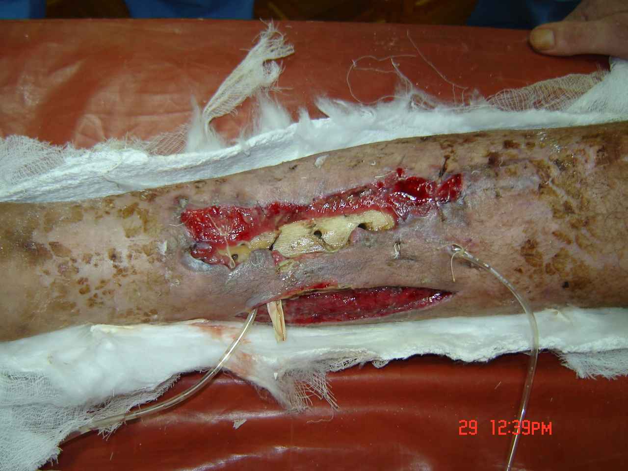При поступлении в наш центр у пациента обширная рана передней поверхности голени с дефектом мягких тканей, в ране на большом протяжении обнажена нежизнеспособная тусклая большеберцовая кость, в том числе зона перелома. Отделяемое из раны гнойное с неприятным запахом.<br>