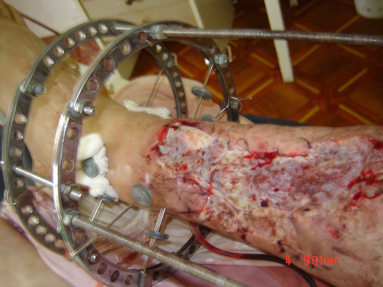 Прооперирован на районе в день поступления- произведен остеосинтез перелома большеберцовой кости металической пластиной. В послеоперационном периоде некроз краёв раны по передней поверхности голени, нагноение, остеомиелит. Была попытка свести края раны путём нанесения послабляющих разрезов по боковым поверхностям голени.