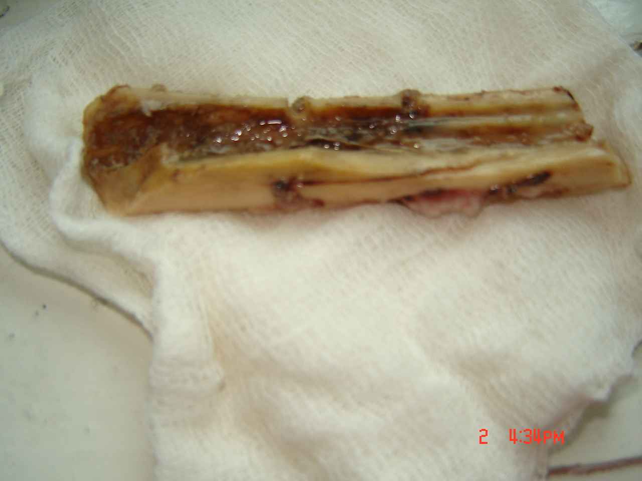 На операции после резекции осцилирующей пилой передней поверхности обнажённой части большеберцовой кости, в костно-мозговом канале большое количество гноя, задняя поверхность большеберцовой кости тусклая. Некрэктомия и остеосеквестрэктомия, из костно-мозговых каналов оставшихся верхнего и нижнего отрезков большеберцовой кости умеренное кровотечение. Произведена транспозиция мышечного лоскута передней большеберцовой мышцы на ветвях передней большеберцовой артерии в область ложа большеберцовой кости, мышцей закрыты верхний и нижний отрезки большеберцовой кости. На мышечное ложе уложены свободные расщеплённые мышечные лоскуты, взятые с правого бедра. Произведен стабилизирующий остеосинтез правой голени спицами,фиксированными и натянутыми в аппарате Иллизарова.<br>