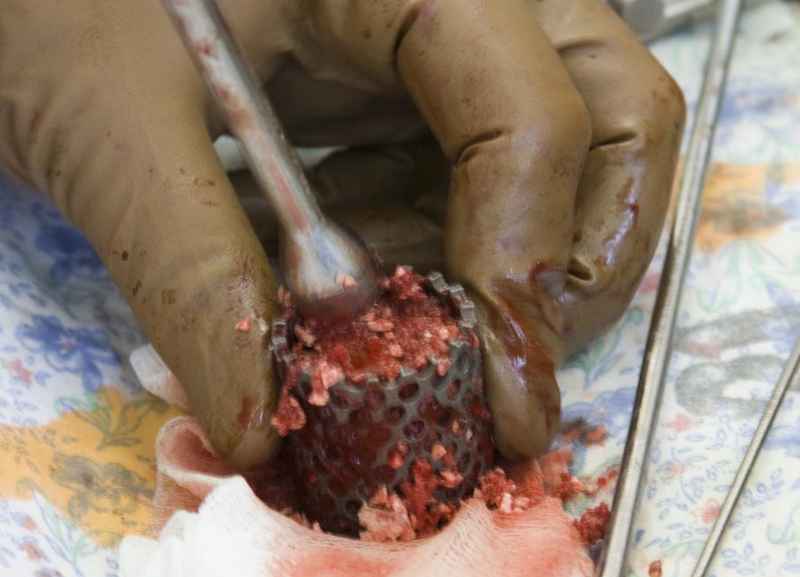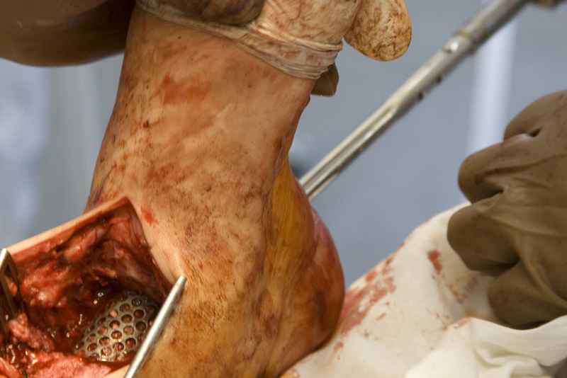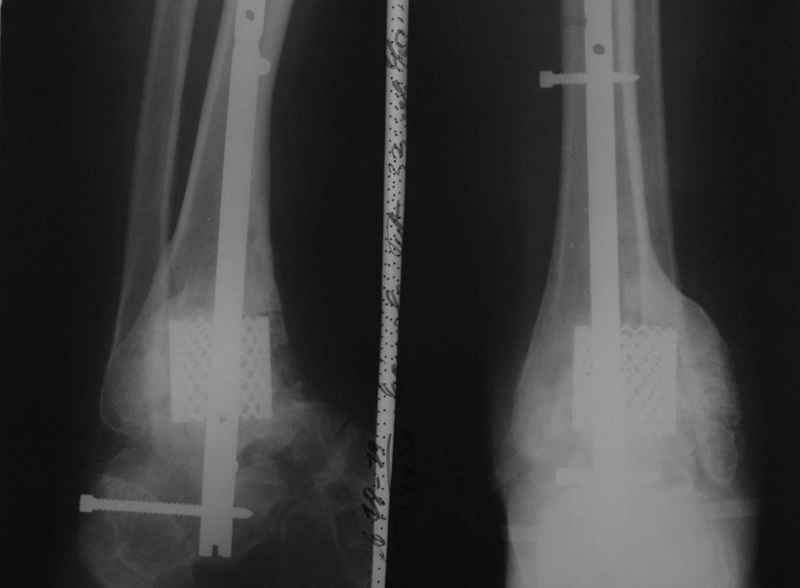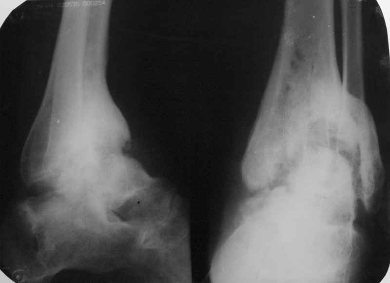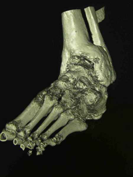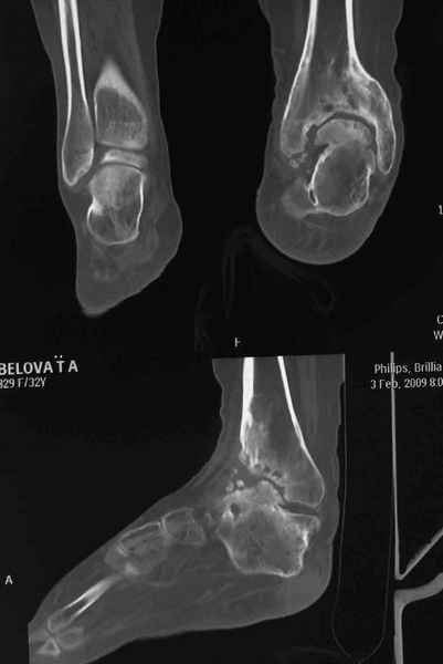 Пациентка Б. получила травму 2001 году в результате падения с высоты. За это время дважды выполнялись неудачные попытки артродезирования голеностопного сустава. Больная перед нами поставила одну задачу - восстановить опороспосонбность левой нижней конечности и только. Принято решение выполнить кейдж-артродезирование левого голеностопного сустава блокируемым интрамедуллярным гвоздем с установкой сетчатого опорного трансплантата, костной аутопластикой плюс Chronos. С целью профилактики рецидива деформации выполнили ахиллотомию (считаем, что неудачи предшествующих операций связаны с варусной тягой ахиллова сухожилия в ррезцльтате неправильно сросшегося перелома пяточной кости). На сегодняшний день - два месяца с момента операции. Пациентка перемещается в циркулярной повязке с полной нагрузкой на больную ногу.