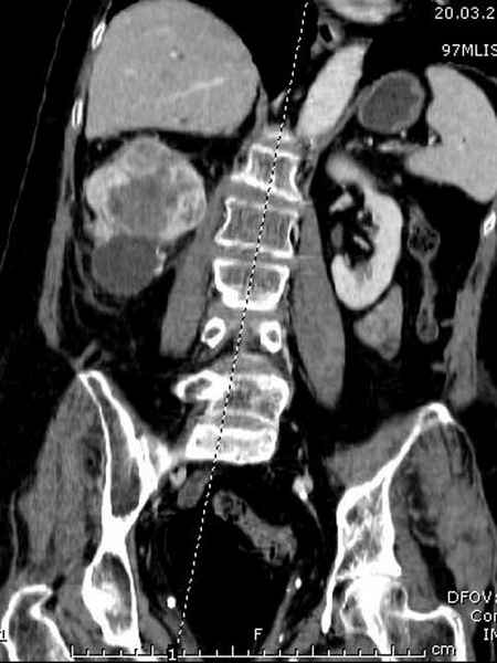 Со слов, больная ничем не болела, только последние 3 месяцев чувствовала боли в бедренной области. КТ брюшной полости подтвердил увеличенную правую почку. (5-6)