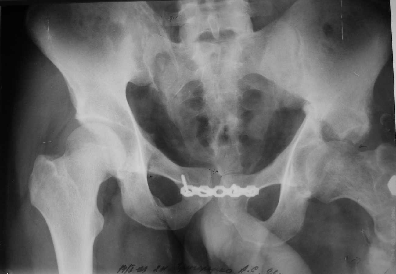 Также имеется травматическая деформация таза с трансвертлужным переломом на стороне дефекта.