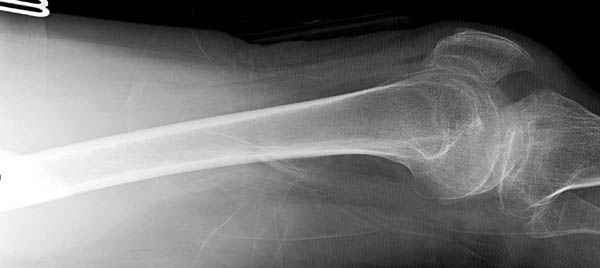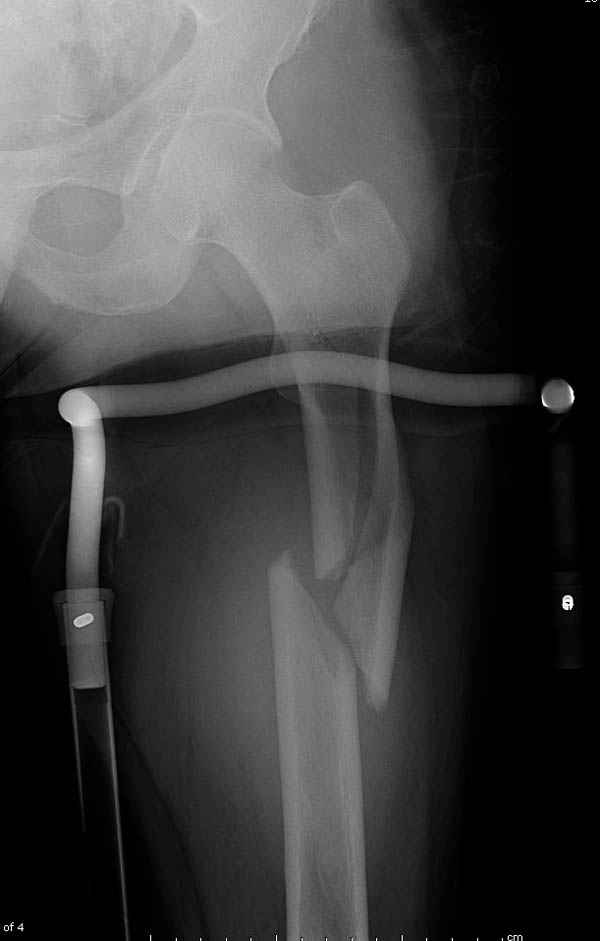 При поступлении бедро напряженное, сосудистых и неврологических расстройств нет. На рентгенограмме оскольчатый перелом бедра с вовлечением проксимальной спирали в шейку бедра.