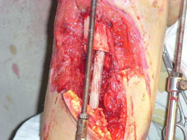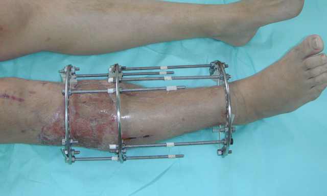 Тогда можно рассмотреть вопрос одновременного удаления штифта, мышечной (в данной области применим проксимально отсеченный лоскут камбаловидной мышцы) или микрохирургической (что более надежно) пластики дефекта мягких тканей, остеотомии проксимального фрагмента большеберцовой кости, остеосинтеза блокируемым штифтом с а/б покрытием, наложения простого аппарата Илизарова (можно из полуколец) для дистракции на штифте. При данном варианте пациент сохраняет возможность полной опоры на ногу, что очень важно для заживления у пожилого пациента) и отпадает необходимость в проведении дополнительный операций (при благоприятном развитии событий).