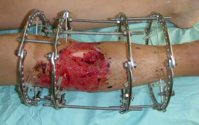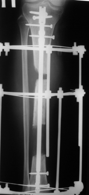 Выкладываю картинки похожей пациентки. Извините, что без окончательных снимков (сейчас их нет под рукой). Правда мы имели проблемы у данной больной после снятия аппарата, когда промежуточный фрагмент большеберцовой кости сместился на 1,5 см дистально и отошел от проксимальной части кости. До сих пор у пациентки на снимках определяется лишь тонкая полоска кости по задней поверхности за штифтом (образовалось что-то вроде маленького регенерата)в области стыковки промежуточного и проксимального фрагментов. Большая пока решила подождать. Не хочет оперироваться, так как ходит не хромая, работает.