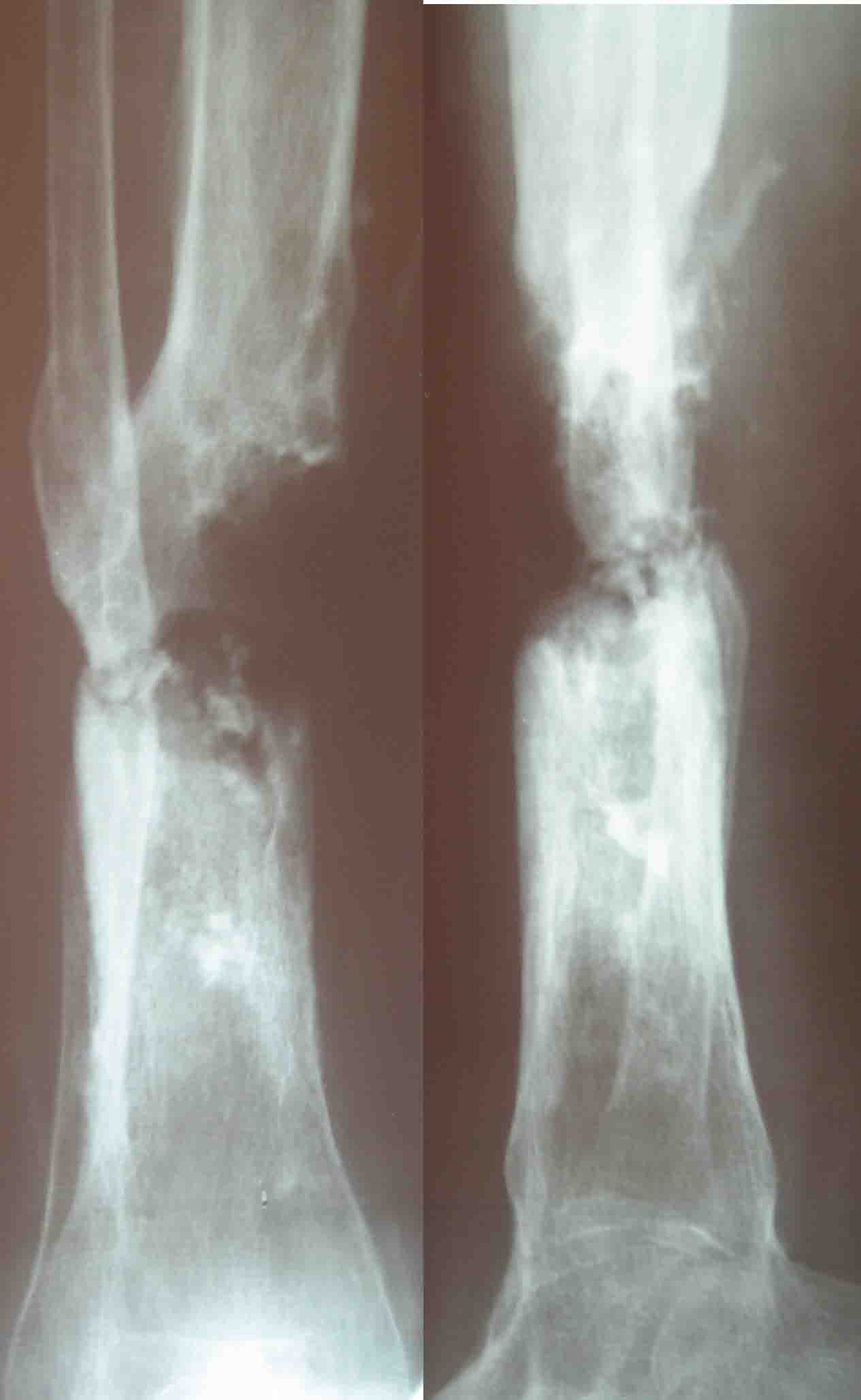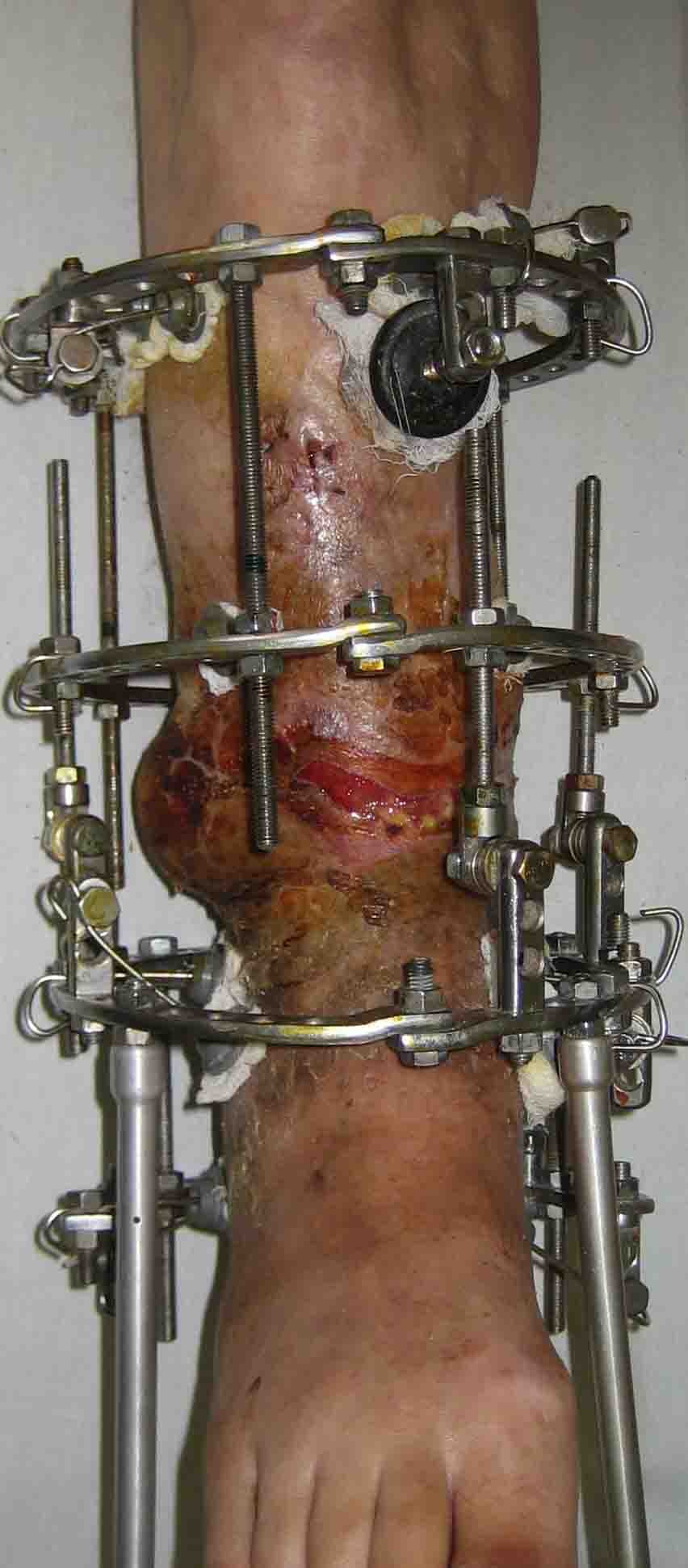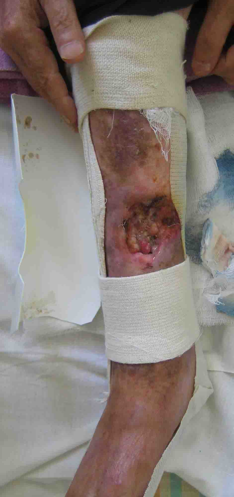 патологическим переломом, хронической язвой и гипсовой лонгетой попал