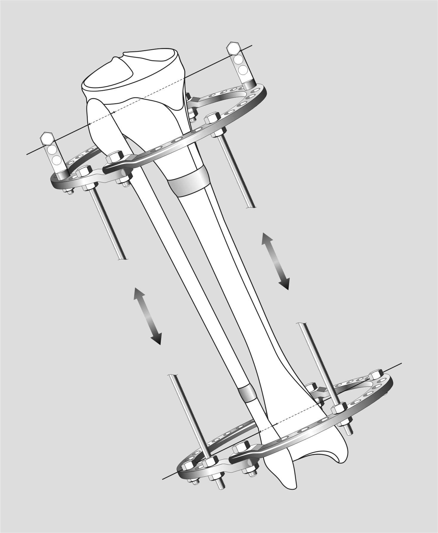 Суть методики заключается в том, что голень удлиняют на 1,5-2 см, выполнив остеотомию большеберцовой кости, но не выполняя
