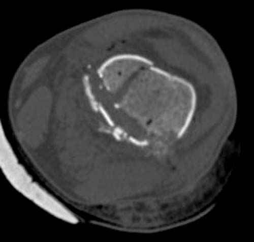 У молодого человека огнестрельное слепое ранение н/3 правого бедра. Поступил в клинику с внутрисуставным многооскольчатым Т-отразным переломом дистального отдела бедренной кости. Дополнительно на СТ-исследовании обнаружен перелом внутреннего мыщелка Hoffa со смещением.<br><br>