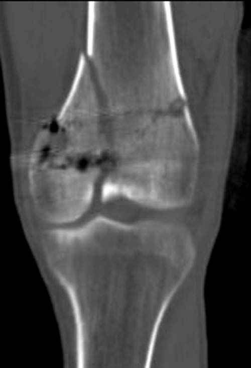 Больной взят в операционную на второй день, где из небольшого медиального доступа выполнена артротомия коленного сустава. Произведена репозиция отломков, фиксация винтами. Попутно удалена пуля. Первым делом была достигнута репозиция медиального мыщелка (перелома Hoffa, где коронарная плоскость перелома трудно поддается закрытой репозиции и фиксации. ) Затем была достигнута идеальная репозиция суставной поверхности бедра и фиксация компрессирующими headless screws.<br><br>