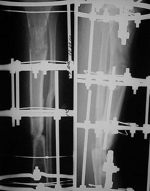 по Илизарову. Но при стыковке отломков возникла рекурвация голени до