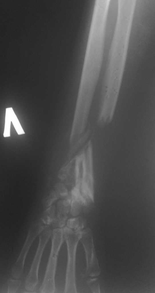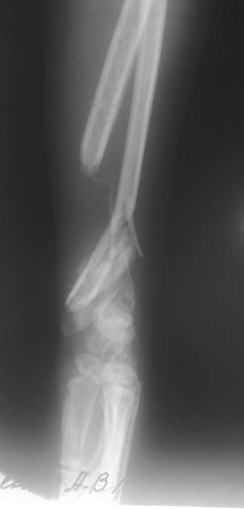 С момента травмы перелом предплечья был фиксирован анкерно-спицевым