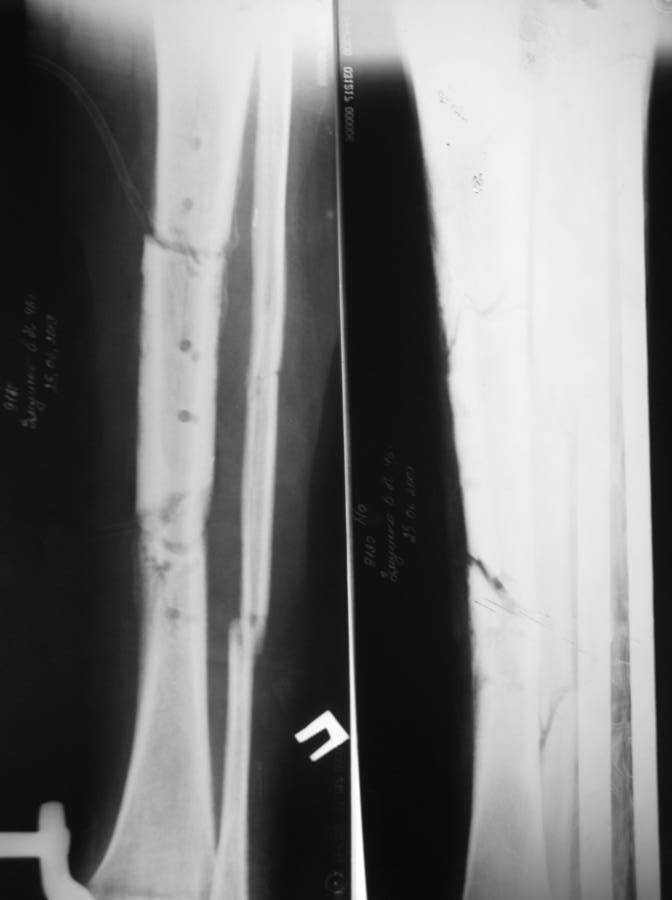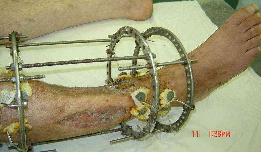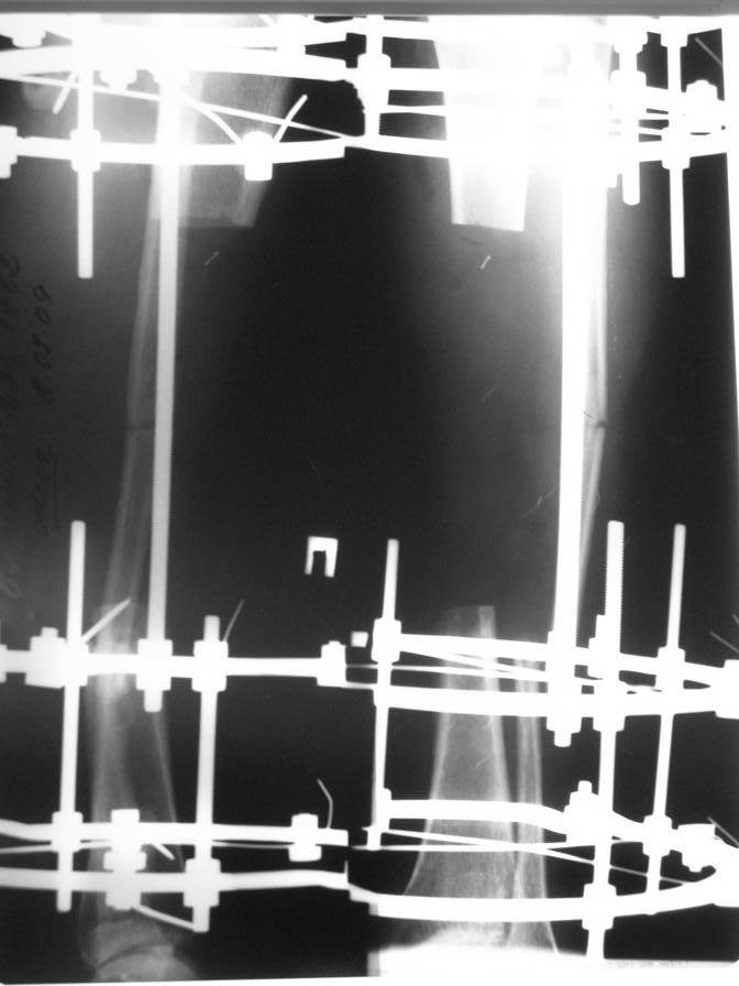 Недавно оперирован повторно- малоберцовая кость пересечена на уровне верхнего и нижнего отрезков большеберцовой кости, перемещена на область дефекта большеберцовой кости, фиксирована в аппарате. Рентгенснимки и фото голени больного прилагаю.<br>