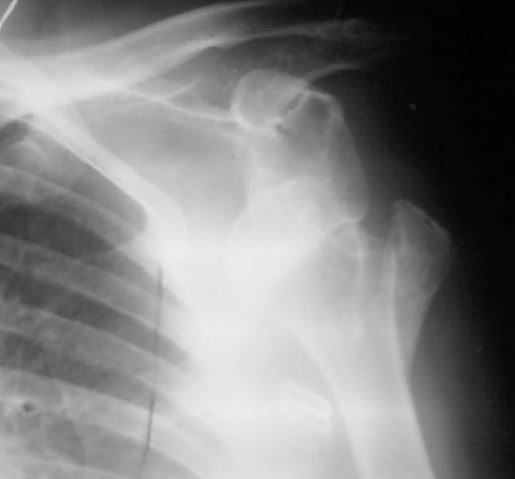 На рентгенснимке левого плеча в передне-задней проекции полный вывих плеча с отрывом