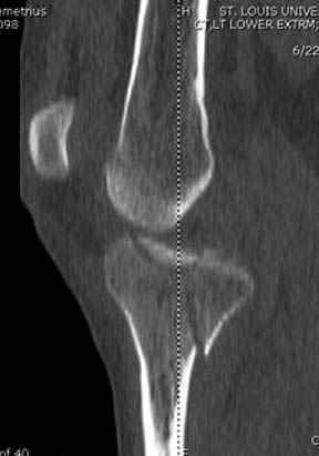 На представленных предоперационных срезах КТ огромный задне-медиальный фрагмент расположен больше кзади, чем медиально. Для планирования, кроме поперечных срезов, надо ориентироваться на корональные срезы, которые укажут топографию верхушки медиального фрагмента.