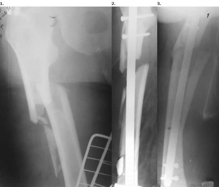 Пациент 56 лет поступил в отделение 28.12.09 со свежим переломом в/3 правого бедра. 15.01.10 произведен закрытый БИОС гвоздем Sanatmetal (d13мм), во время которого произошло раскалывание проксимального и дистального отломков. ЭОПа в больнице нет, для определения локализации направителя ползовались стареньким "Арманом". После заведения гвоздя по проводнику снимки на столе больше не делали, дистальное блокирование оч.быстро с использованием электромагнитной навигации. В послеоперационном периоде выраженные боли и отек. На контрольных рентгенограммах вот такая картина. После посмотрели за экраном - гвоздь стоит стабильно как в проксимальном, так и в дистальном отломке,но контакта между проксимальным и дистальным нет. Вопросы: